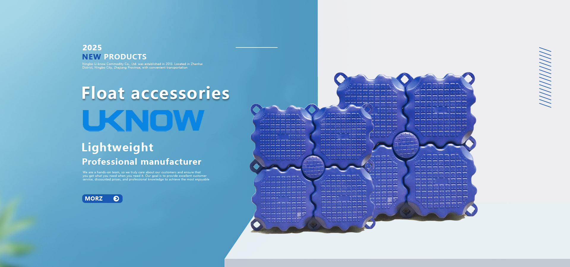 Ningbo U-know Commodity Co., Ltd. was established in 2013. Located in Zhenhai District, Ningbo City, Zhejiang Province, with convenient transportation. So far, the company continues to be a leader in innovative design, materials, manufacturing quality, and value. All of our products are made of tough, impact resistant high-density polyethylene and can withstand temperatures below zero degrees Celsius. We specialize in producing various high-quality, lightweight, but very durable products such as floating dock pontoons, floating barriers, and balls. We are a hands-on team, so we truly care about our customers and ensure that you get what you need when you need it. Our goal is to provide excellent customer service, discounted prices, and professional knowledge to achieve the most enjoyable customer experience.